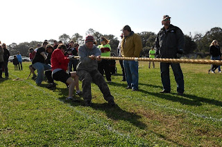 The next day was Matt's birthday. He told me he wanted to just spend the day relaxing so that's what we did. He also said he wanted to go to 2 cheaper meals rather than one expensive meal so we ate Larry's Giant Subs for lunch and Season of Japan for dinner. I was not upset about that! Matt forgot that he also signed up to play on a tug of war team for charity for my job so we went to that (pics also below). It was fun and good for us to get out and get fresh air. Funny thing is that it was 55 degrees and people were acting like it was oh so cold and it made us laugh b/c 55 degrees is a nice spring day in KY. Turns out we adjusted to cold while in KY for 4 years and are no longer wimps!